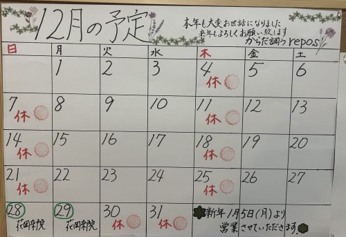 12月は花岡先生が28日、29日にご来院されるため28日日曜日も営業しております!日曜日、治療希望される方ご来院お待ちしております!